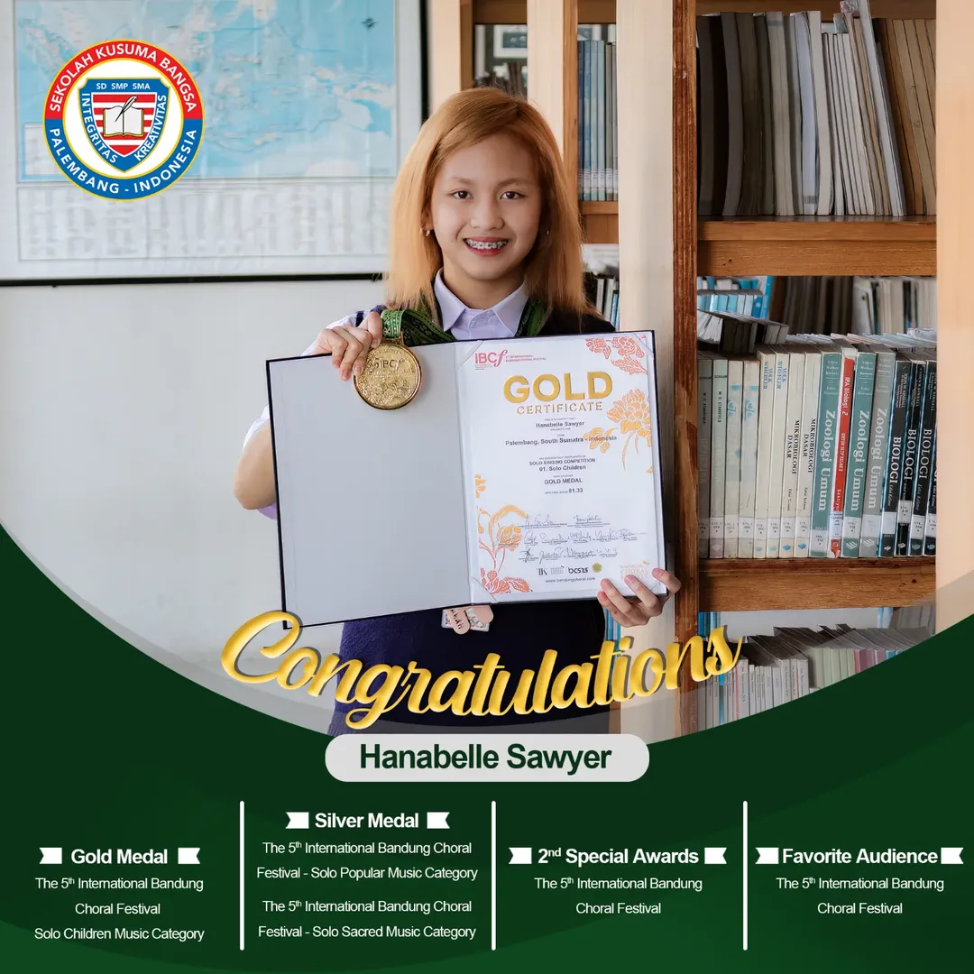 Segenap keluarga besar SMP Kusuma Bangsa dengan bangga mengucapkan selamat kepada Hanabelle Sawyer atas pencapaiannya yang luar biasa dalam ajang The 5th International Bandung Choral Festival, tidak hanya satu, tetapi empat penghargaan sekaligus: