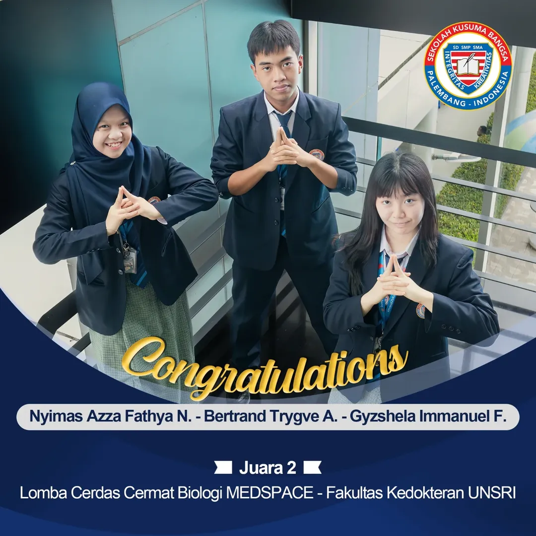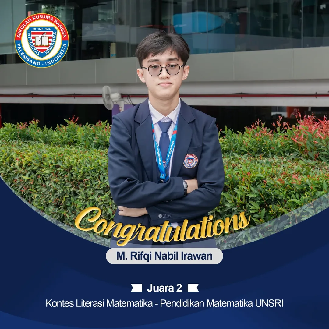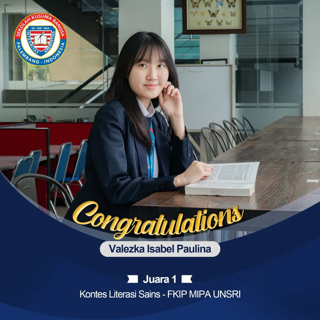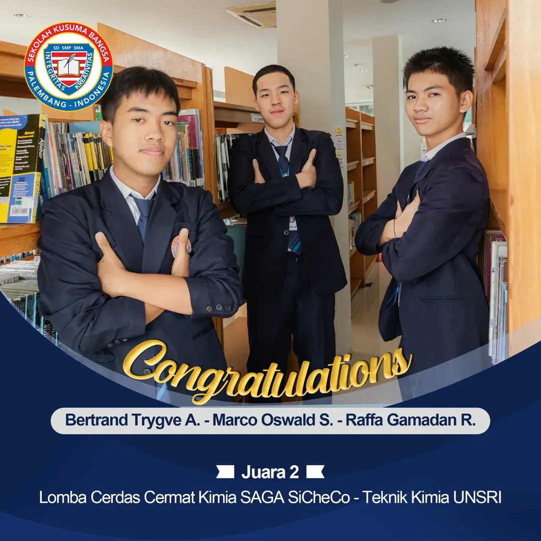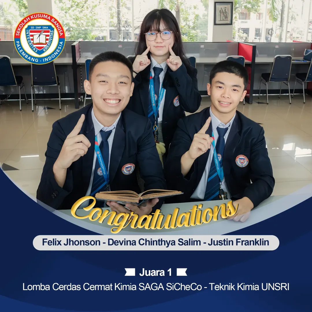 Selamat dan sukses kami ucapkan kepada murid SMA Kusuma Bangsa yang telah meraih Juara 1 dan Juara 2 di berbagai Kontes Literasi (Sains dan Matematika) serta Lomba Cerdas Cermat (Kimia dan Biologi) yang diadakan oleh UNSRI.