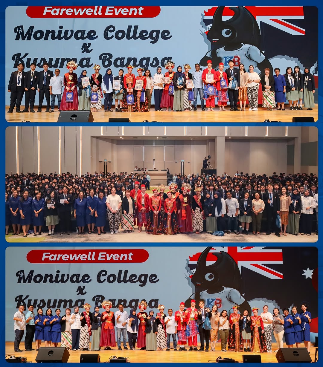 Acara perpisahan (Farewell Event) antara Monivae College, Australia, dan Kusuma Bangsa High School sukses digelar dengan nuansa kolaborasi budaya yang luar biasa. Suasana terasa hangat dan penuh keakraban, menandai terjalinnya ikatan persahabatan yang kuat antar pelajar dari dua negara. Kolaborasi di atas panggung, mulai dari pertunjukan musik hingga penampilan busana dan tarian adat, menunjukkan bahwa perbedaan budaya adalah kekayaan yang patut dibanggakan.