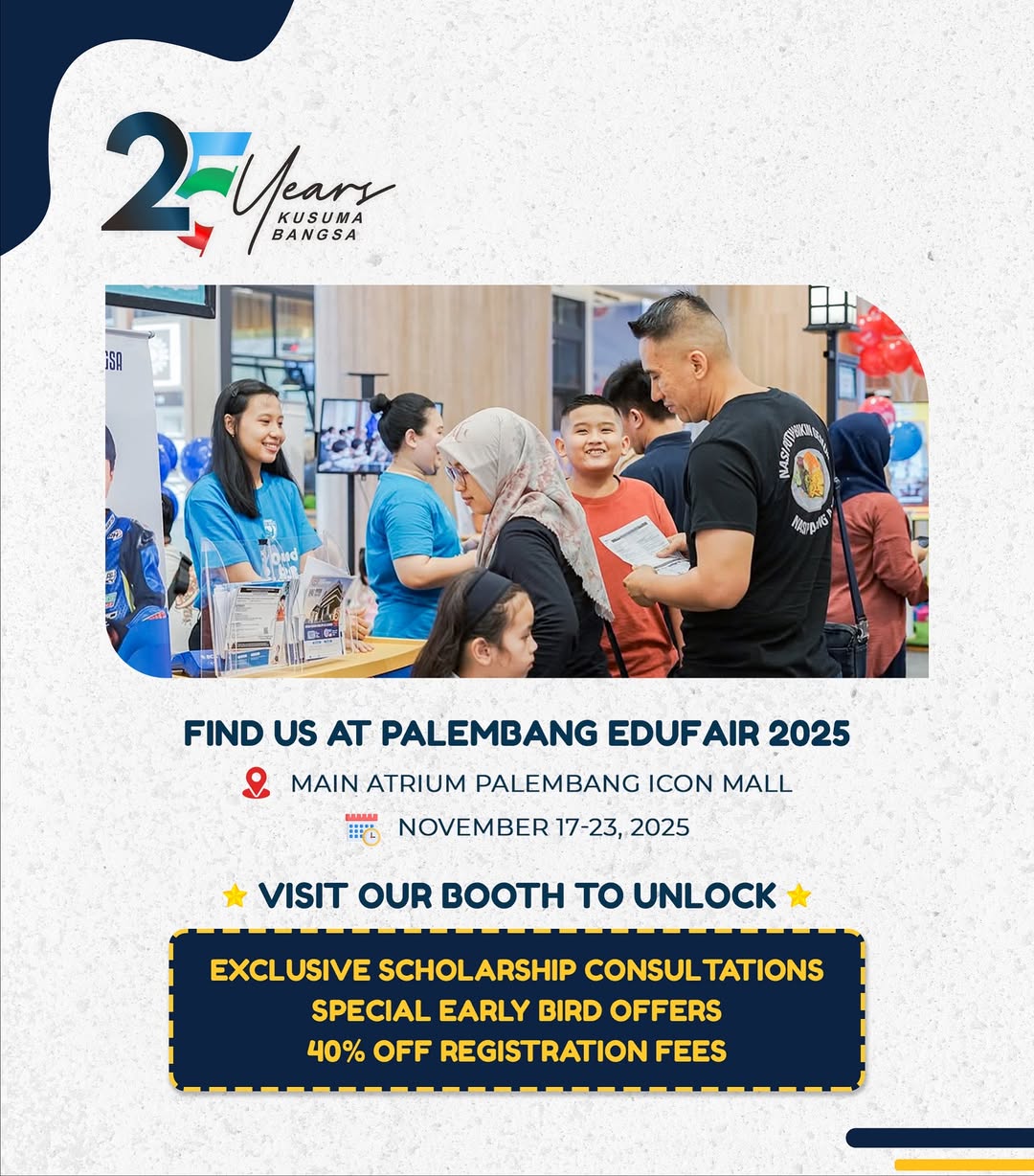Sekolah Kusuma Bangsa bakal BUKA BOOTH di Palembang Edufair 2025 di PICON! Dapatkan info pendaftaran dari jenjang TK, SD, SMP, dan SMA 🥳